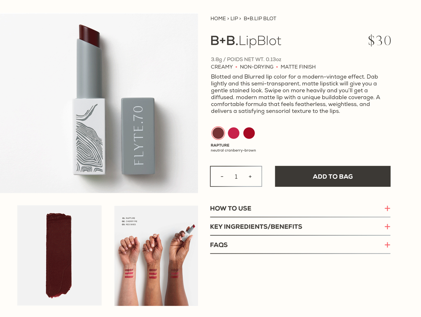 Holistic brand development and creative strategy for cosmetics start-up Flyte.70. The brand is elevated, vibrant, luxurious, and authentic—core values that resonate with the target audience of women 35 and older. All brand touch points from visual identity, packaging, product styling, and custom e-commerce website work together to create a cohesive brand experience.