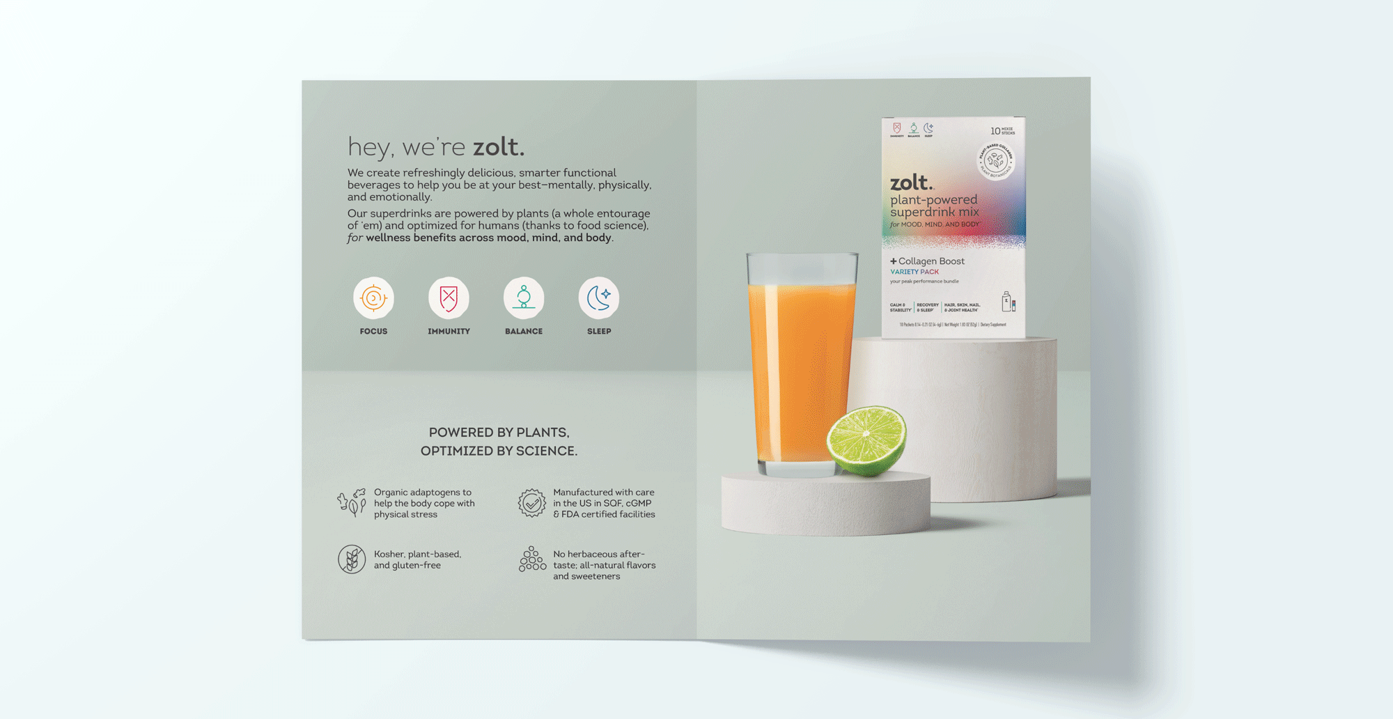Creative strategy and brand development for Zolt, a plant-powered superdrink mix disrupting the beverage space. The brand utilizes a strategic color system to bring clarity to a robust product line and structure. The overall look and feel is bright, fun and approachable for the average consumer.